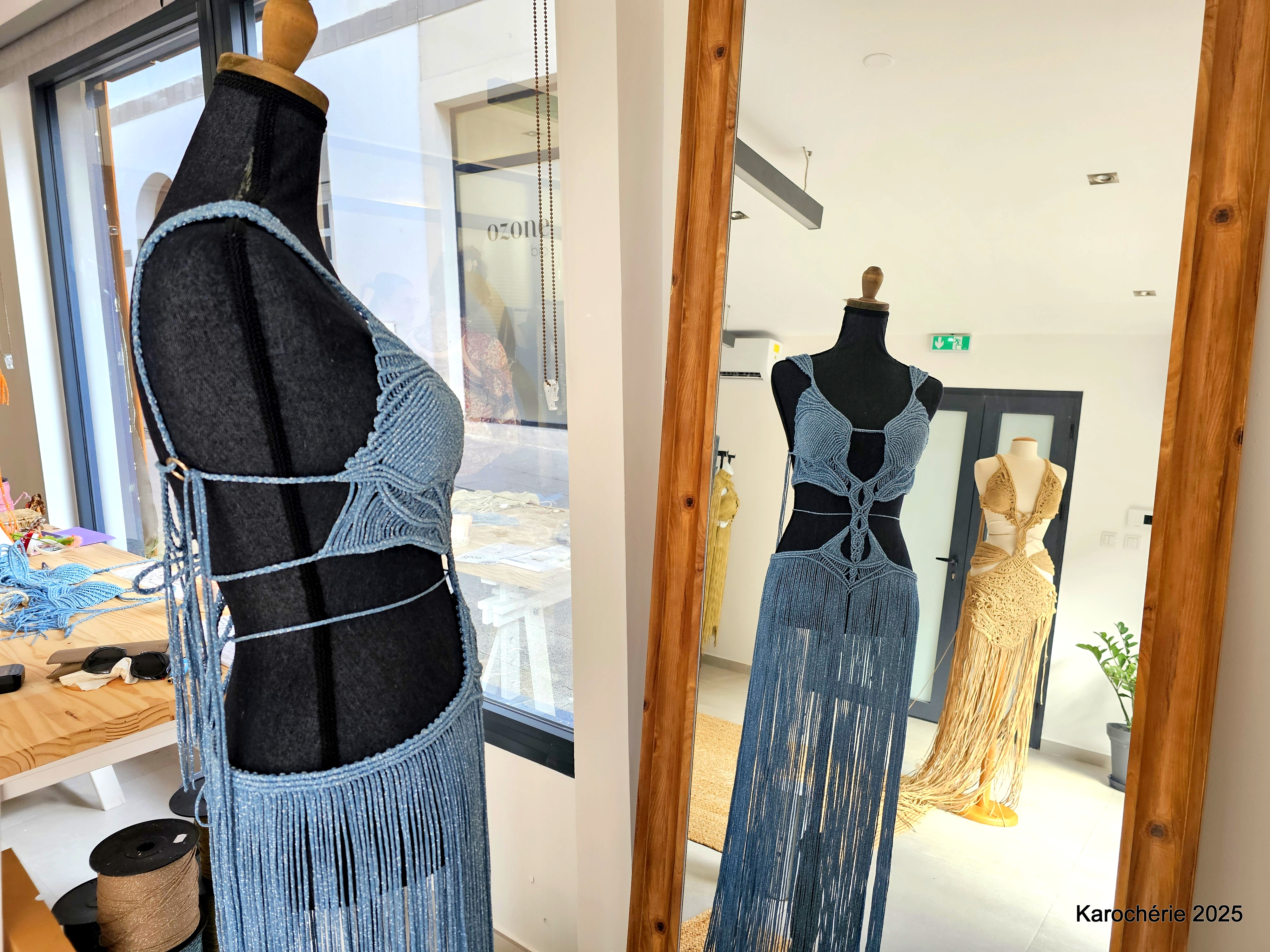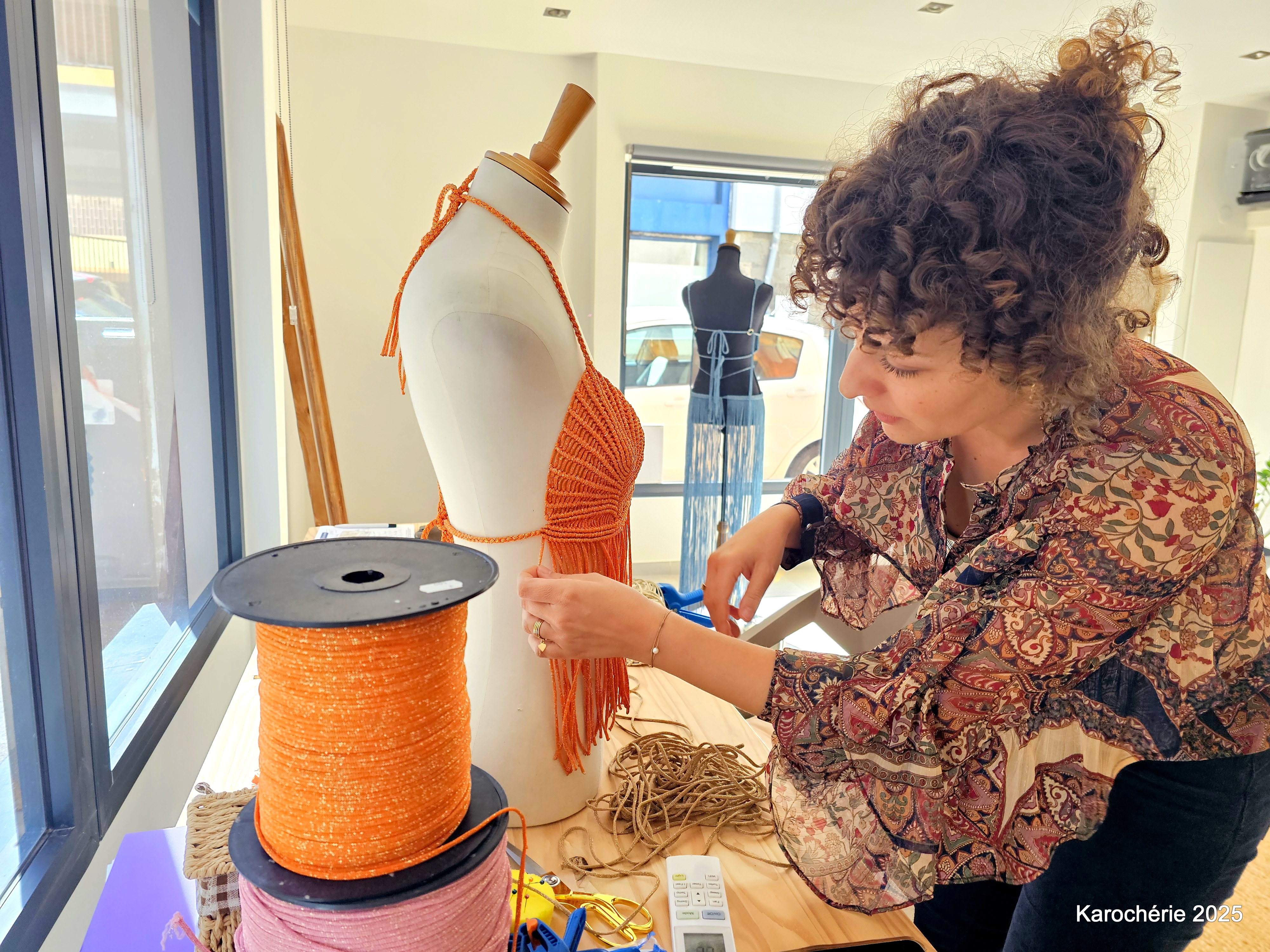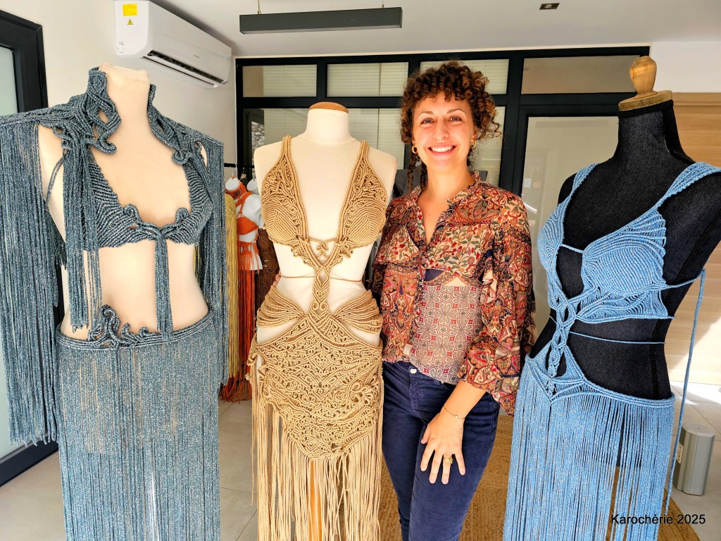 Elle commence alors à tisser, d’abord des suspensions pour plantes, puis des bijoux en micro-macramé. Peu à peu, les gestes deviennent plus amples, les projets plus audacieux. Et un jour, elle réalise sa première robe. Sans patron, sans couture. Juste des nœuds.