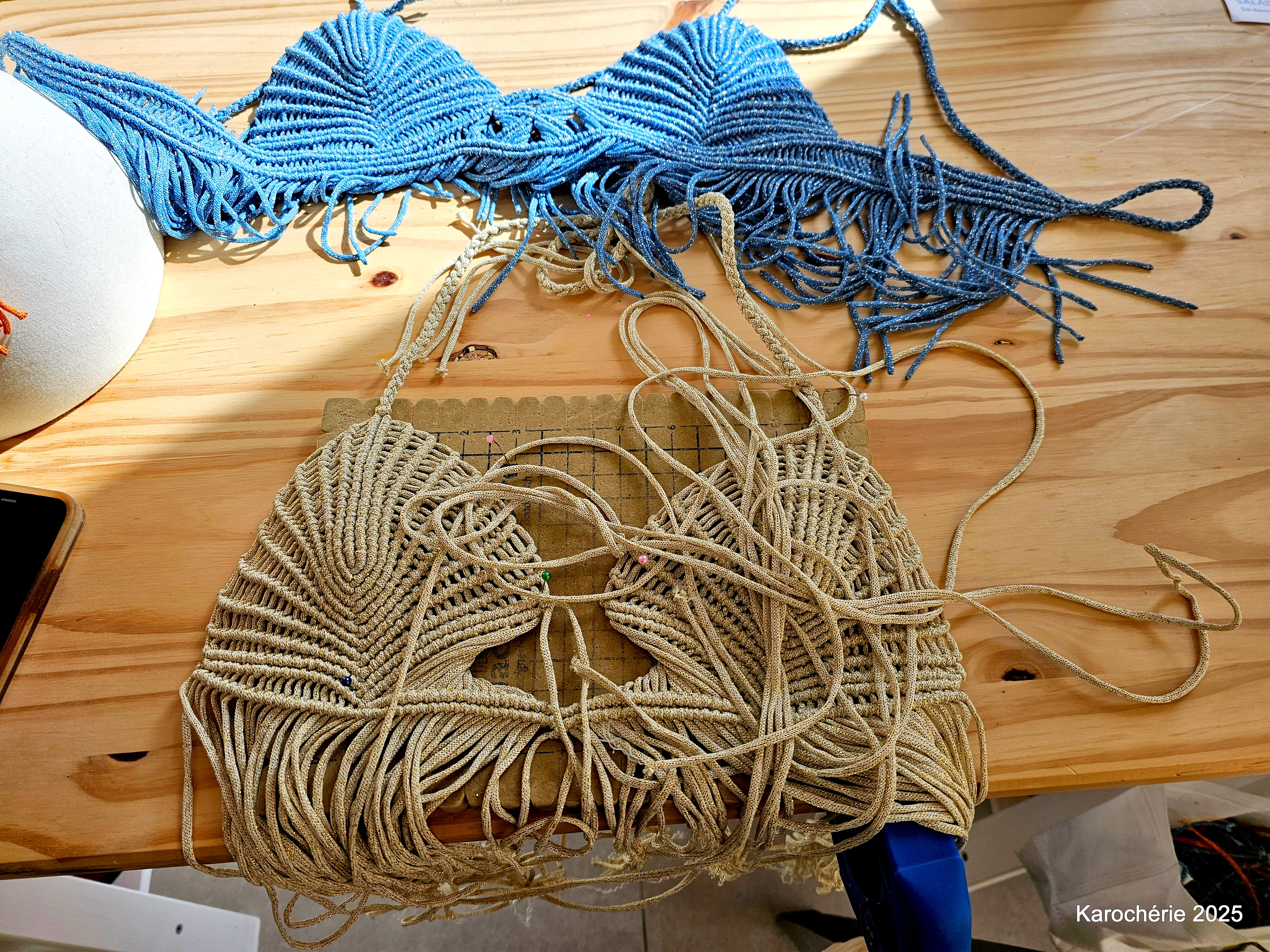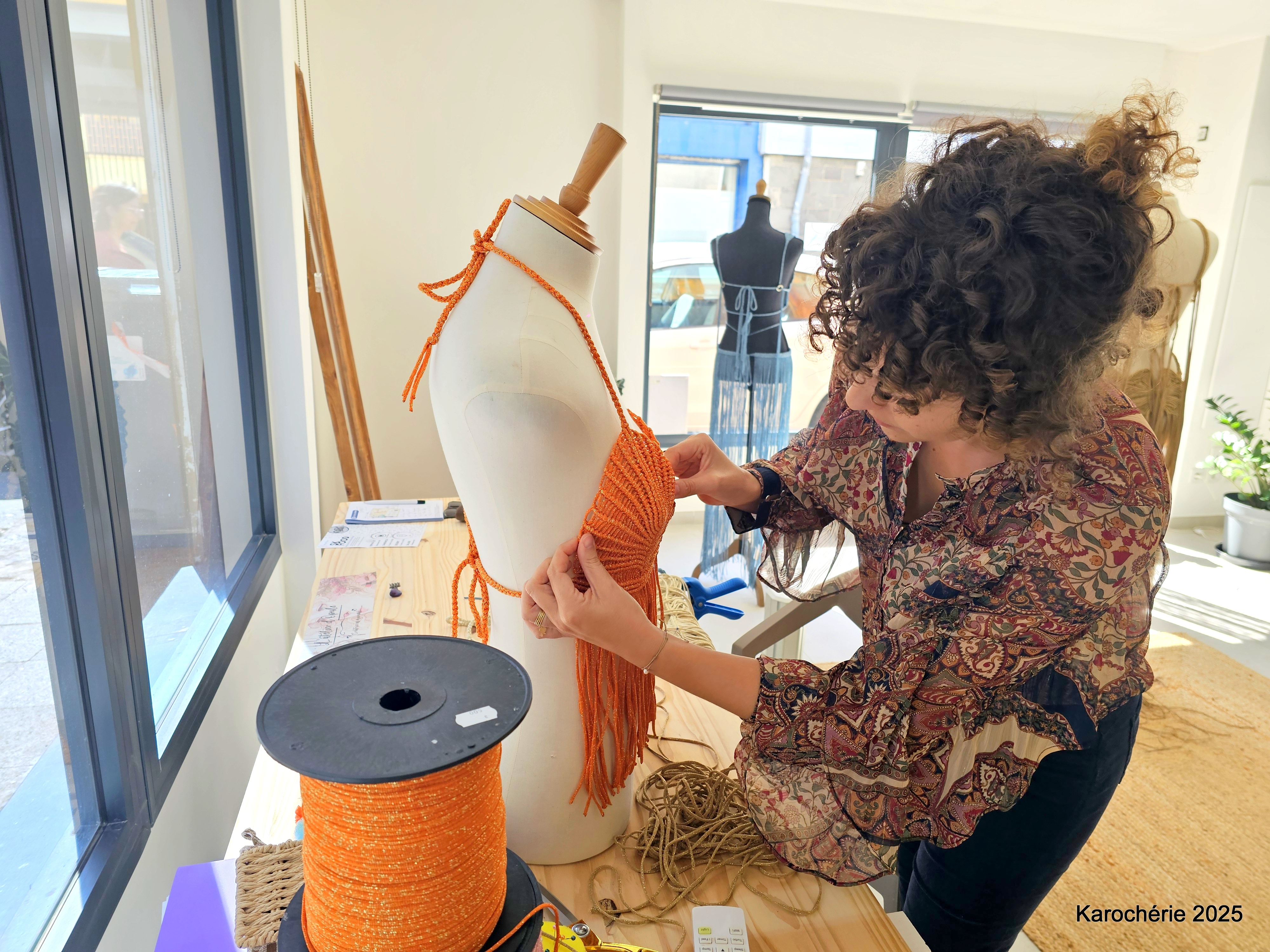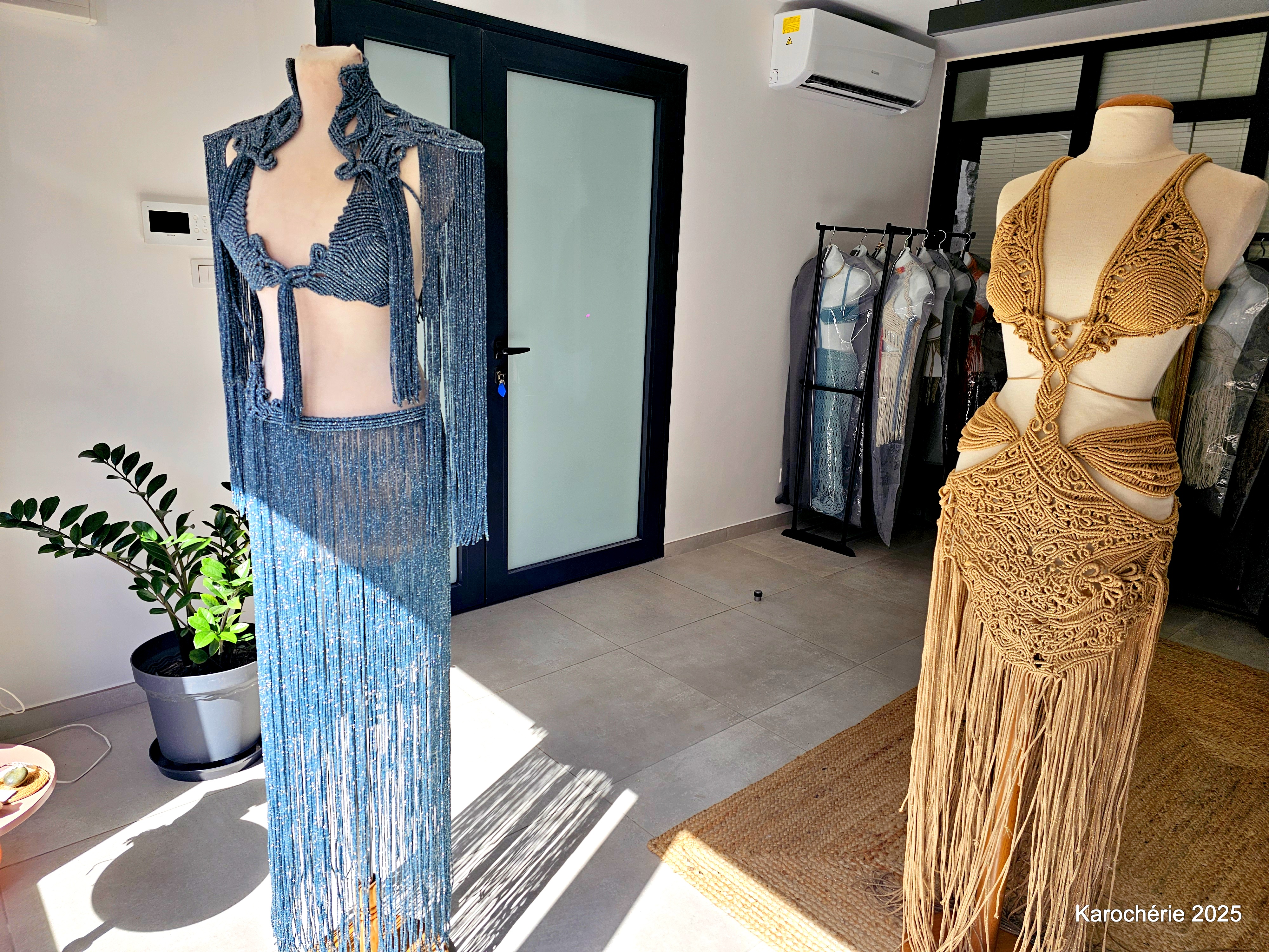 Elle commence alors à tisser, d’abord des suspensions pour plantes, puis des bijoux en micro-macramé. Peu à peu, les gestes deviennent plus amples, les projets plus audacieux. Et un jour, elle réalise sa première robe. Sans patron, sans couture. Juste des nœuds.